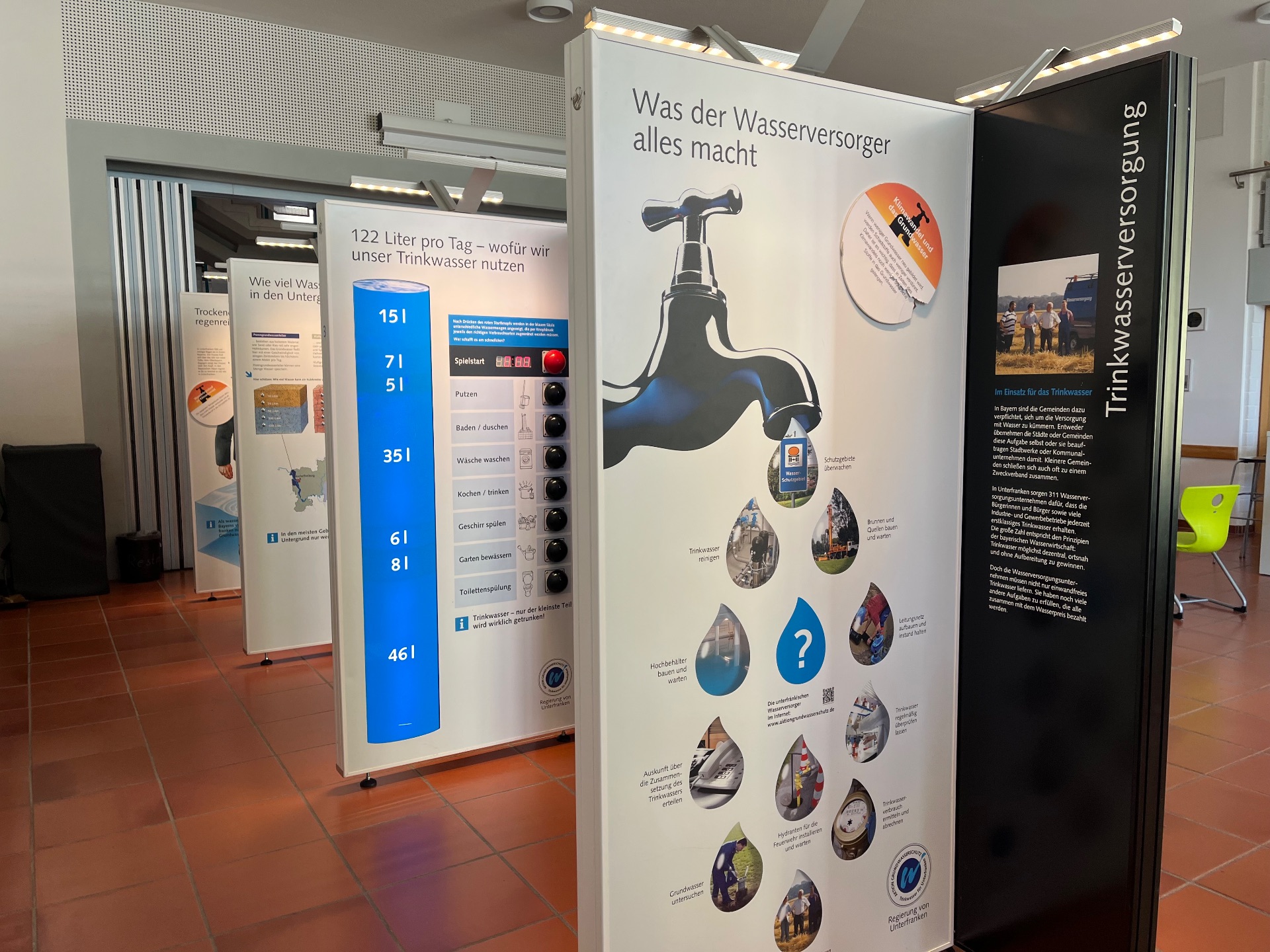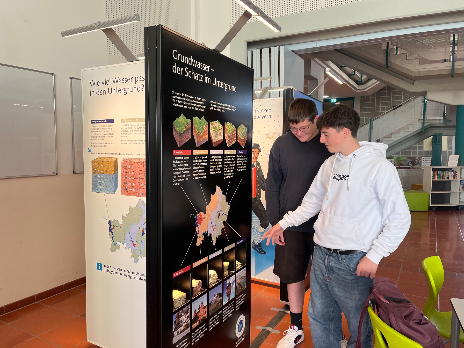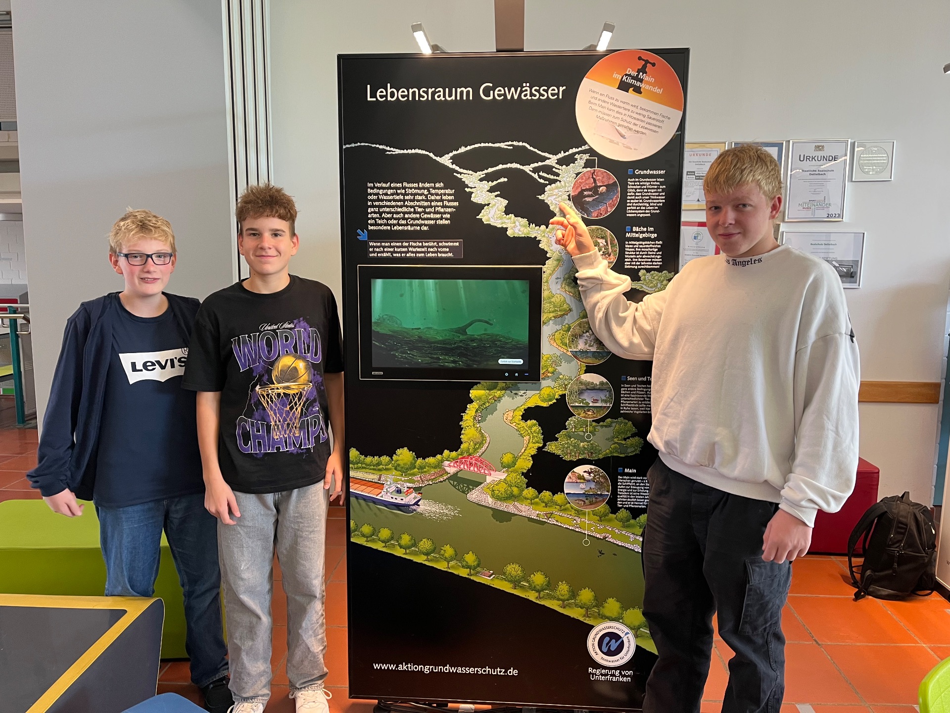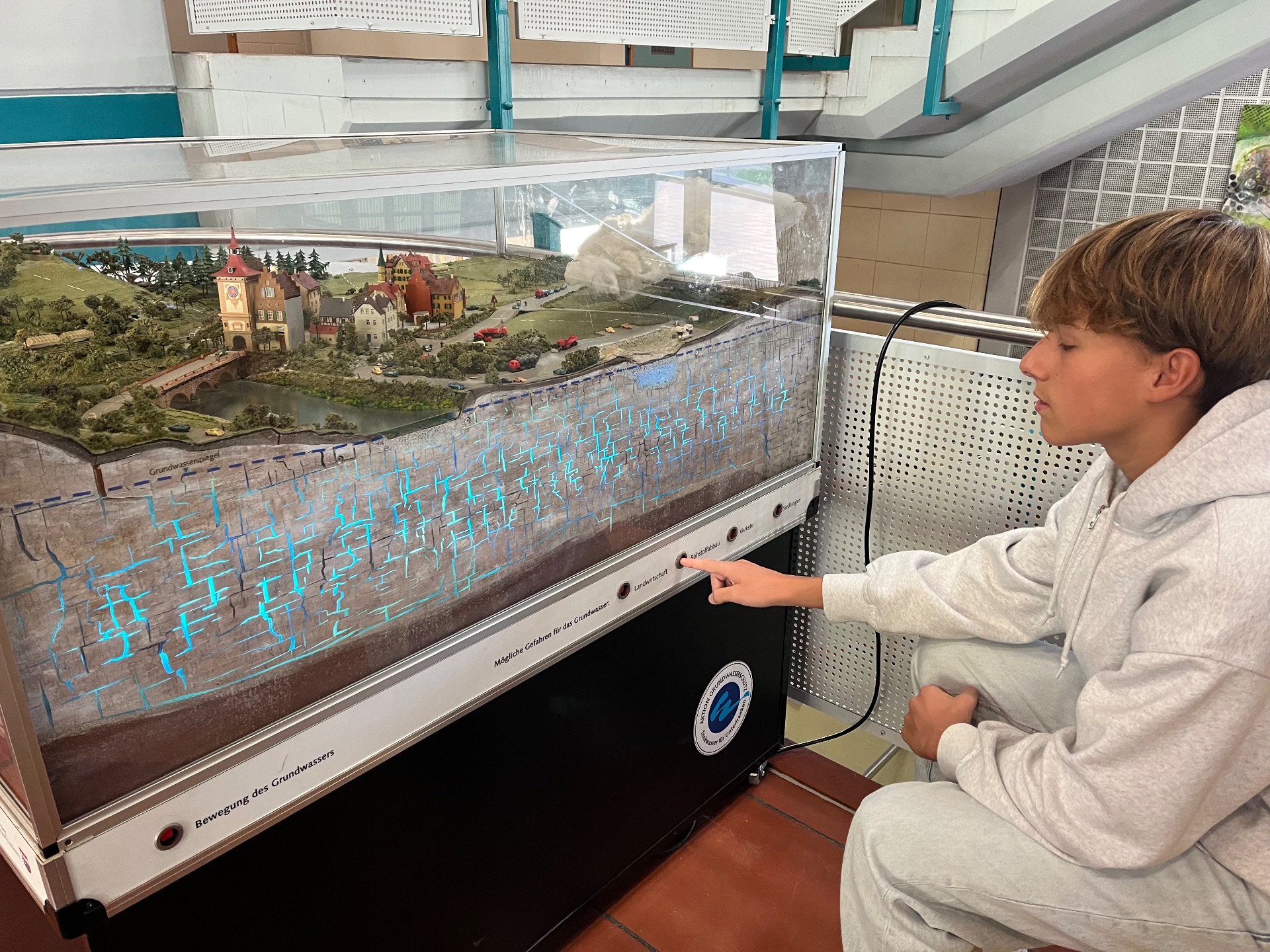 Dass ein durchschnittlicher Unterfranke 128l Wasser am Tag verbraucht, erstaunte viele Schülerinnen und Schüler. Wasserschutz fängt mit dem Wissen über das Wasser an. Das Bewusstsein für den Wert des Wassers und für die Notwendigkeit einer nachhaltigen Entwicklung können nicht früh genug geweckt werden. Kinder und Jugendliche sind daher eine der wichtigsten Zielgruppen der AKTION GRUNDWASSERSCHUTZ. Vor allem ihnen, als Hoffnungsträger für die Zukunft unserer Erde, müssen wir nahebringen, was nachhaltige Entwicklung bedeutet. Wasser, unser wichtigstes Lebensmittel und ein wichtiger Lebensraum, ist ein gutes Thema, um damit anzufangen. Daher spricht die neue Ausstellung sowohl Erwachsene als auch Kinder und Jugendliche an. Die Wanderausstellung „Trinkwasser für Unterfranken“, die im Rahmen der Aktion „Grundwasserschutz der Regierung Unterfranken“ entwickelt wurde, kann noch bis Mitte Oktober in der Aula der Staatlichen Realschule Dettelbach besucht werden. Mit zahlreichen interaktiven Elementen zum Ausprobieren und Informationstafeln werden wichtige Informationen rund um das Thema Trinkwasser aufgezeigt und im Rahmen des Biologie- bzw. Geographie-Unterrichts mit den Schülerinnen und Schülern besprochen. Auch die vierten Klassen der benachbarten Rudolf-von-Scherenberg Grundschule besuchten diese sehenswerte „Wasserschule“.