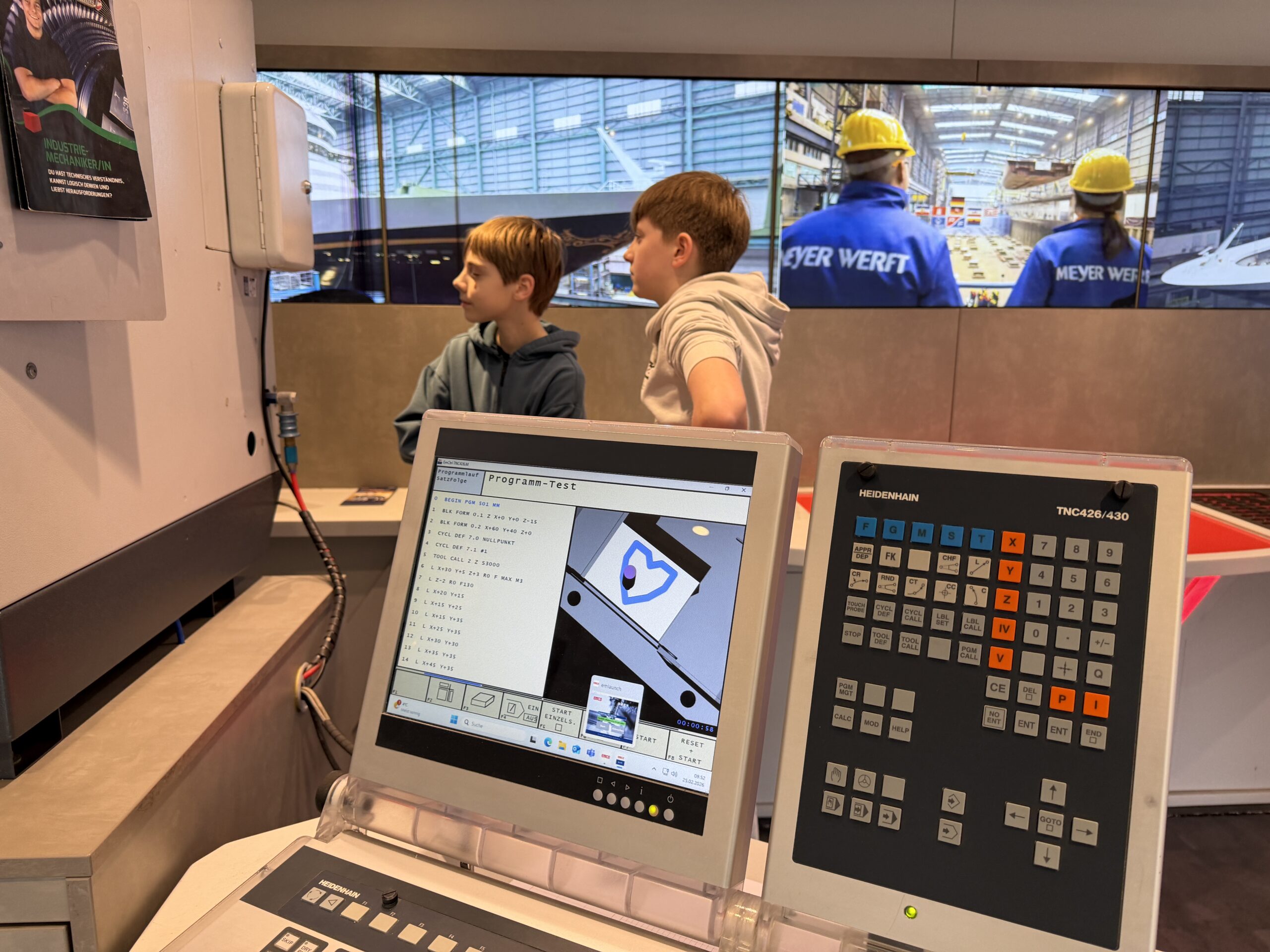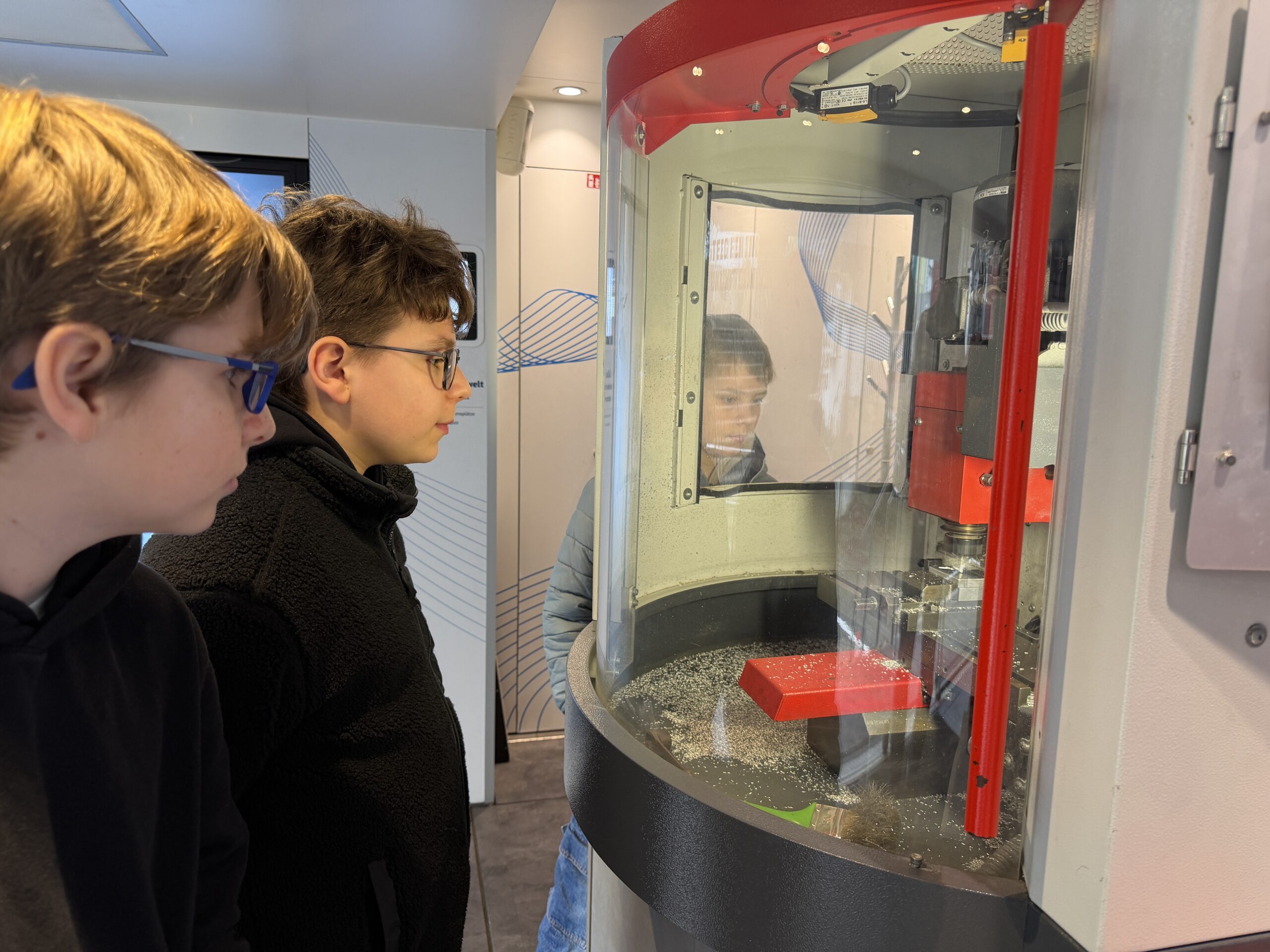 - Praxisstationen (Erdgeschoss): Hier konnten die Schülerinnen und Schüler selbst Hand anlegen. An einer computergesteuerten CNC-Fräsmaschine fertigten sie unter Anleitung kleine Werkstücke und lernten dabei die Präzision der modernen Fertigung kennen. Ein besonderer Anziehungspunkt war der „Cobot“ – ein kollaborativer Roboter, der gemeinsam mit den Jugendlichen ein Getriebe montierte. Solche Technologien verdeutlichten eindrucksvoll den Wandel hin zur Industrie 4.0.