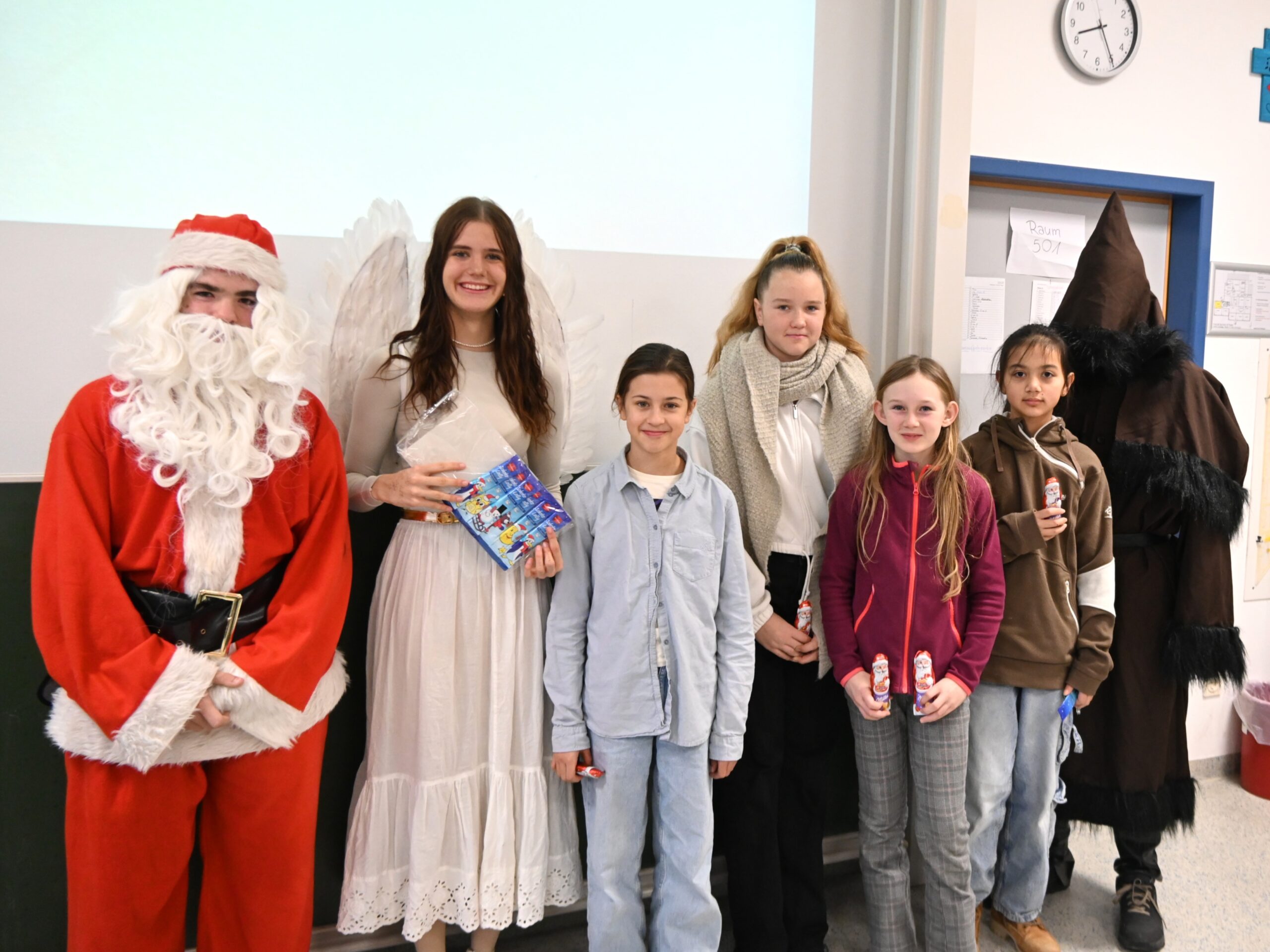 An der Realschule Dettelbach herrschte am 5. Dezember große Freude, denn die traditionelle Nikolausaktion stand auf dem Programm. Dieses Jahr haben sich die Schülersprecherinnen und Schülersprecher etwas ganz Besonderes einfallen lassen und schlüpften in die Rollen des Nikolaus, Rupprecht und einem Engel.