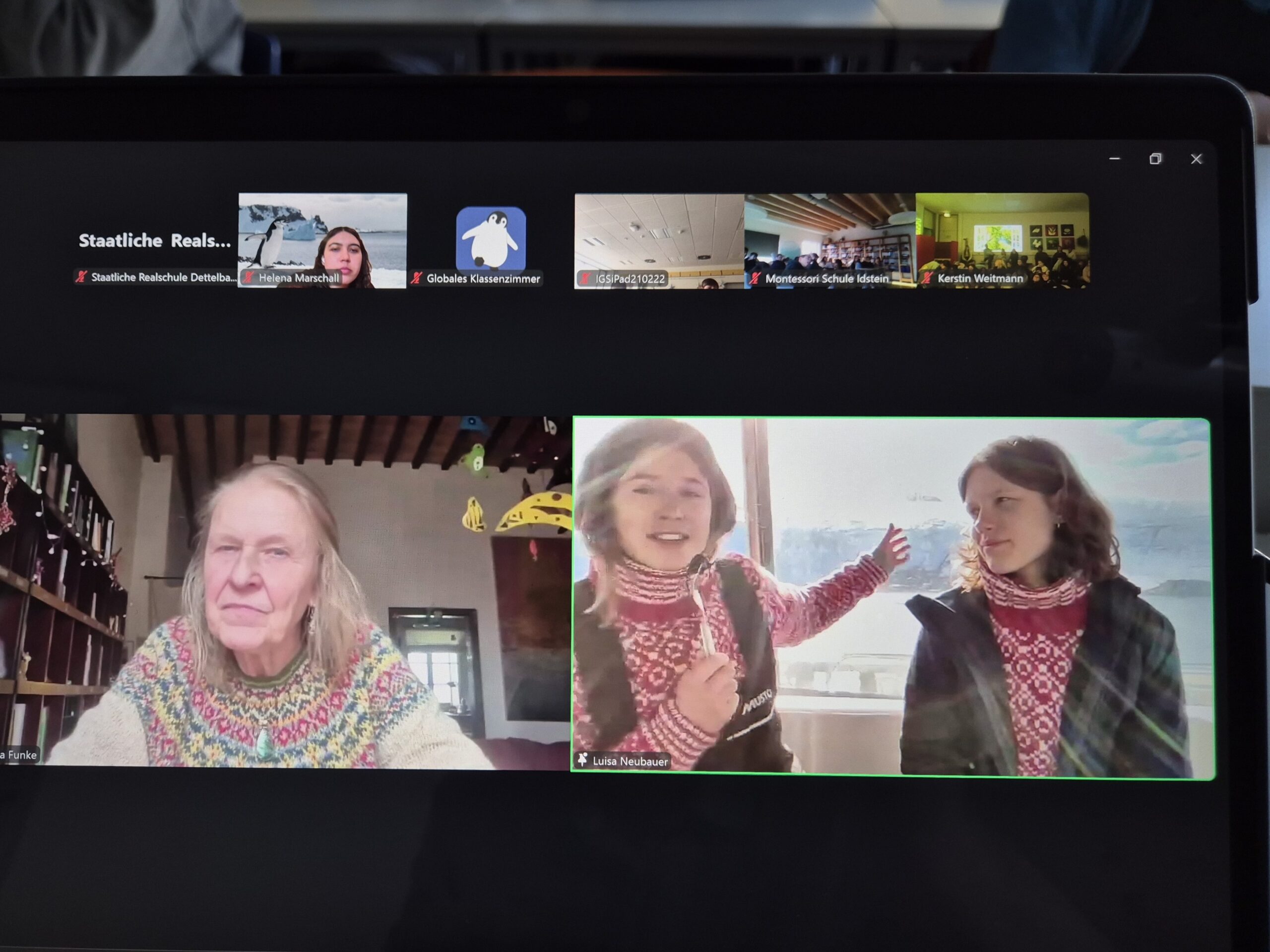 Mitte Januar konnten mehrere unserer Klassen am „Globalen Klassenzimmer“ teilnehmen – einer digitalen Unterrichtsstunde direkt aus der Antarktis. Teilnehmende Schüler:innen schalteten sich per Zoom zum Live-Stream mit Klimaaktivistin Luisa Neubauer, der Kinderbuchautorin Cornelia Funke und weiteren Expert:innen an Bord der Malizia Explorer zu. Dabei erhielten sie faszinierende Einblicke ins Ökosystem der Antarktis, den Klimawandel und die Ozeanforschung.